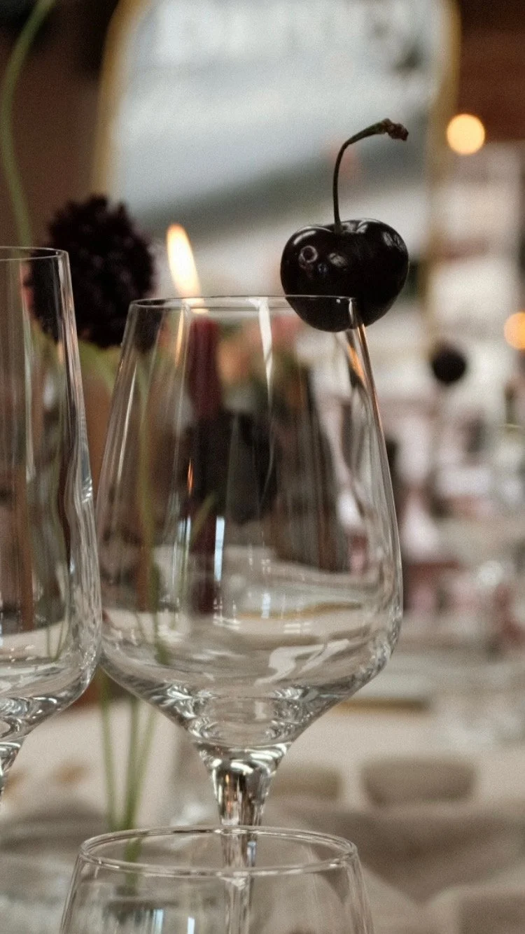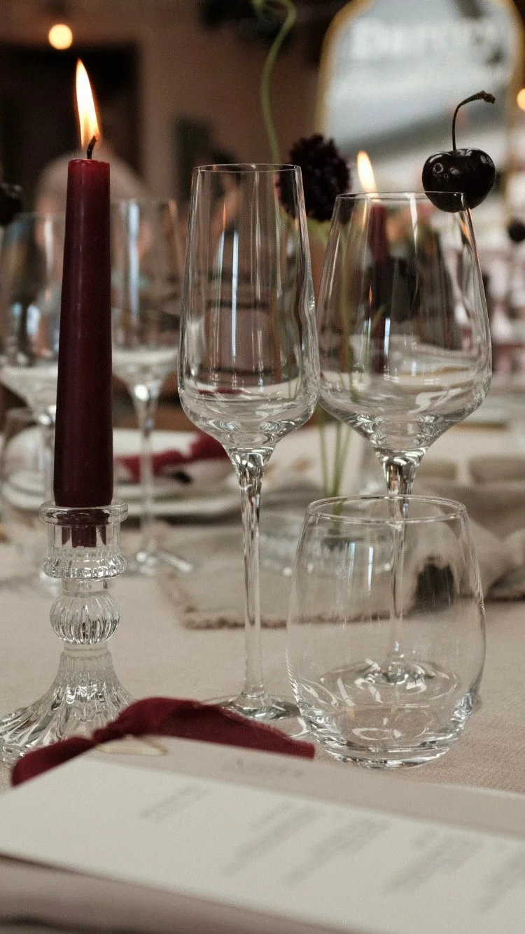 A contemporary tablescape of ikebana scabiosa, textured tableware, pops of burgundy stationery and cherries. It’s a total vibe!